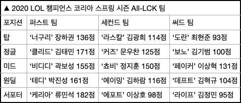 ‘2020 LOL 챔피언스 코리아(이하 LCK)’ 스프링 시즌의 포지션 별 최고의 선수가 모두 결정됐다. 담원의 ‘너구리’ 장하권과 함께 ‘올 LCK팀(All-LCK Team)’을 수상한 선수는 ‘클리드’ 김태민, ‘비디디’ 곽보성(이상 젠지), ‘테디’ 박진성(이상 T1), ‘케리아’ 류민석(이상 드래곤X)이다.