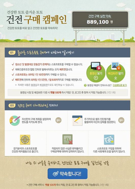 체육진흥투표권 스포츠토토의 수탁사업자인 ㈜케이토토가 합법인터넷발매사이트인 베트맨(www.betman.co.kr)에서 진행하고 있는 ‘건전 구매 실천 서약’ 에 서명한 스포츠팬들이 어느덧 88만 9,100명에 이르는 등, 대중적이면서도 건강한 스포츠레저 게임으로 다수의 국민들에게 인정받게 됐다고 전했다.