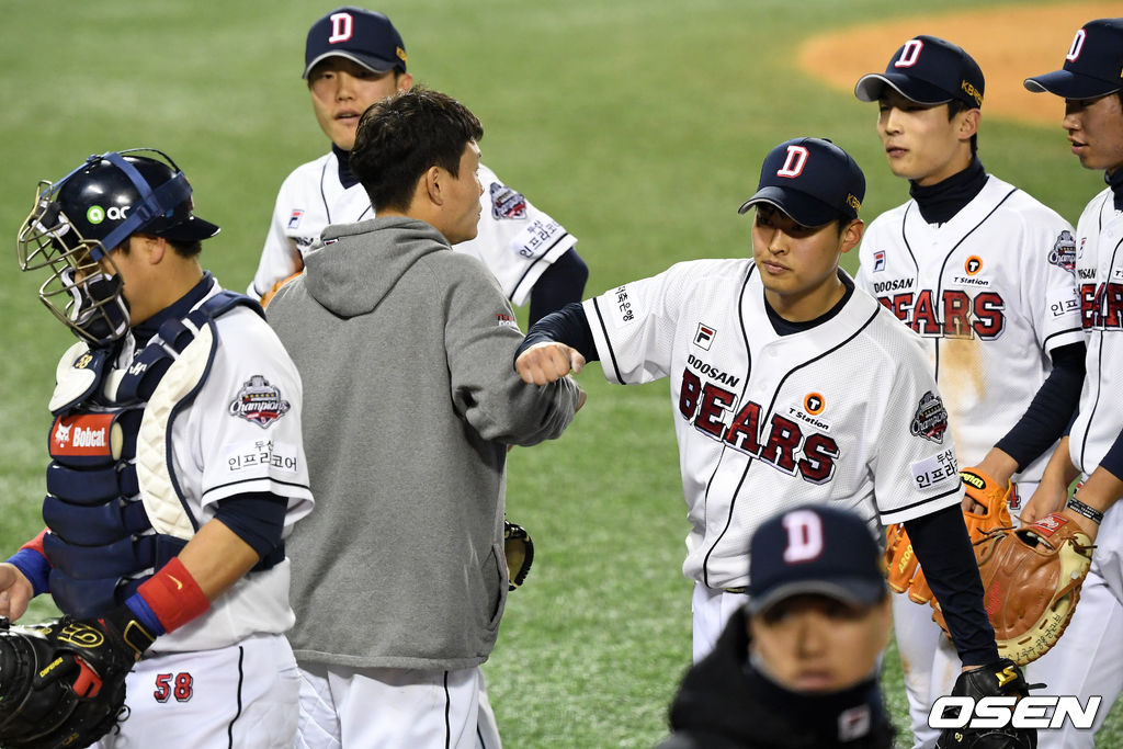 경기 종료 후 두산 선수들이 승리의 기쁨을 나누고 있다./sunday@osen.co.kr