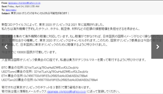 아사히 신문에 따르면 아이치현에 사는 한 70대 남성은 지난 24일 "올림픽이 취소 될 수 있습니다"라고 JOC의 이름으로 메일을 받았다고 한다.