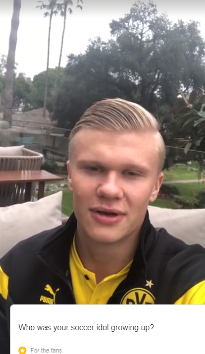이어 홀란드에게 자신의 축구 롤모델을 묻는 질문도 있었다. 정통 골잡이답게 그는 "내가 어렸을 롤모델로 삼은 선수는 호날두와 이브라히모비치다"가 자신의 우상이라 밝혔다.