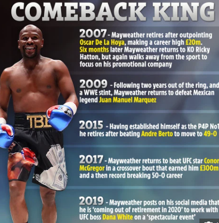 지난 1월 UFC의 대니 화이트 대표는 메이웨더의 복귀전을 추진하고 있다고 밝힌 바 있다. 메이웨더의 복귀전 상대로는 맥그리거나 파퀴아오, 알바레스와 2차전이 거론되고 있다.