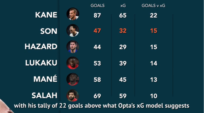 입단 이후 손흥민의 기대 득점은 32골이었으나 실제 리그에서 47골(2015-2016 4골, 2016-2017 14골, 2017-2018 12골, 2018-2019 12골, 2019, 2020 9골)을 기록했다. 기대치보다 무려 15골을 더 넣은 것"