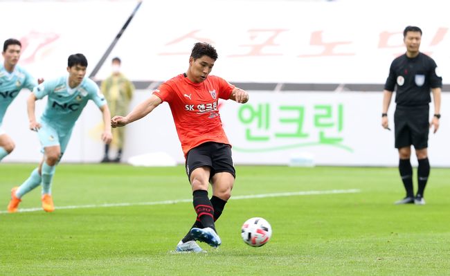 이날 경기서 공민현과 함께 투톱으로 선발 출전한 주민규는 전반 38분 페널티킥 찬스에서 키커로 나서 선제골을 성공시켰다.