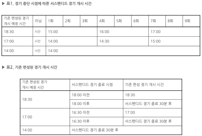 서스펜디드 경기 또는 기존 편성된 경기가 취소될 경우에도 세부 시행세칙이 정해졌다.