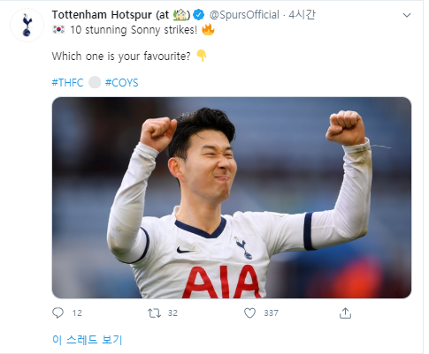잉글랜드 프리미어리그(EPL) 토트넘은 13일(한국시간) "손흥민의 놀라운 10개의 골 중 어떤 것을 가장 좋아하느냐"라고 팬들에게 질문을 던졌다.