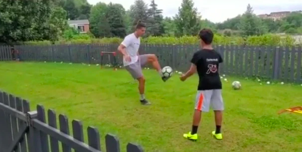 호날두는 잔디가 깔린 뒷마당에서 아들과 함께 트래핑 훈련을 했다. 아들이 공을 던져주면 발로 받아 패스를 했다. 아들 역시 아버지와 패스를 주고받았다.