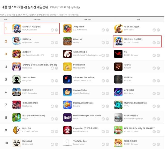 13일 기준 국내 애플 앱스토어 매출 TOP 10에는 ‘카트라이더 러쉬플러스’를 포함해 ‘V4’와 ‘EA 스포츠 피파 온라인4M’, ‘메이플스토리M’까지 넥슨 모바일게임 4종이 랭크됐다.
