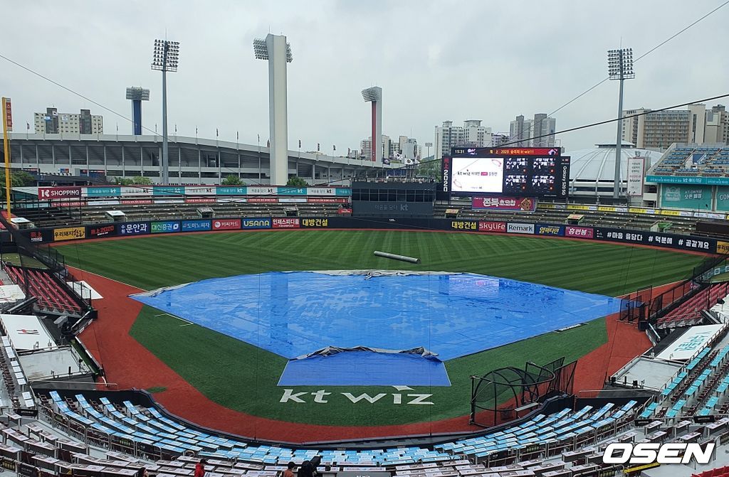 이날 전국에 비 예보가 있던 가운데 수원은 오후부터 빗줄기가 잦아들기 시작했다. 그라운드에는 내야를 모두 덮은 방수포가 있는 가운데 일단 상황을 지켜보고 있다.