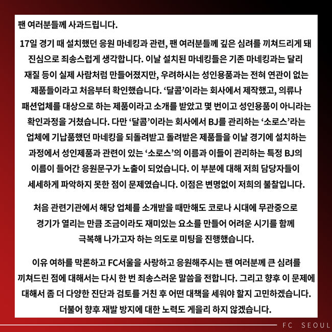서울은 사과문을 통해 "팬 여러분들께 사과드립니다. 17일 경기 때 설치했던 응원 마네킹과 관련, 팬 여러분들께 깊은 심려를 끼쳐드리게 돼 진심으로 죄송스럽게 생각합니다. 이날 설치된 마네킹들은 기존 마네킹과는 달리 재질 등이 실제 사람처럼 만들어졌지만, 우려하시는 성인용품과는 전혀 연관이 없는 제품들이라고 처음부터 확인했습니다. 이유 여하를 막론하고 서울을 사랑하고 응원해주시는 팬 여러분께 큰 심려를 끼쳐드린 점에 대해서는 다시 한 번 죄송스러운 말씀을 전합니다”라고 밝혔다.