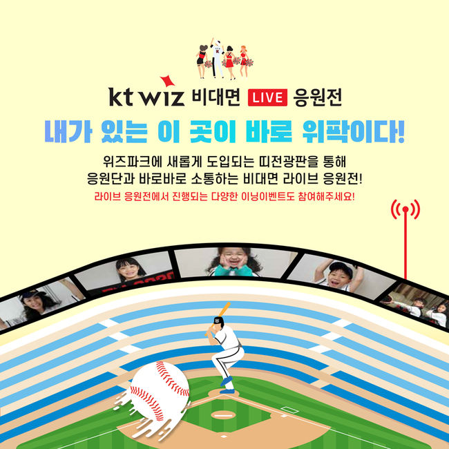 무관중 경기에 대한 아쉬움을 해소하기 위해 홈 개막전부터 진행된 비대면 Live 화상 응원전은 새로 설치된 330m LED 리본보드(띠전광판)를 이용하며 한층 업그레이드 됐다. 특히 이번 홈 경기부터는 팬들의 영상과 음성은 물론, 응원 메시지까지 보여져 KT 선수들에게 힘을 불어 넣는다. 이닝 이벤트에 참여한 팬들에게는 빅또리 인형세트 등 경품도 선사한다.