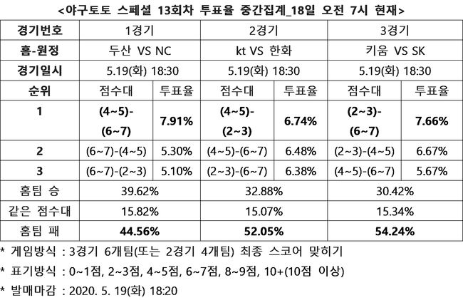 KBO 3경기 대상 야구토토 스페셜 13회차 투표율 중간집계