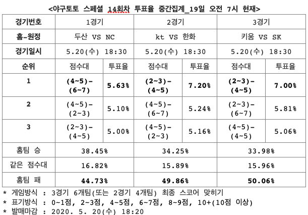 국민체육진흥공단이 발행하는 체육진흥투표권 스포츠토토의 수탁사업자인 ㈜케이토토는 20일(수)에 열리는 2020시즌 한국프로야구(KBO)프로야구 3경기를 대상으로 한 야구토토 스페셜 14회차 투표율을 중간 집계한 결과, 참가자의 49.86%가 kt-한화(2경기)전에서 원정팀 한화의 우세를 전망했다고 밝혔다.