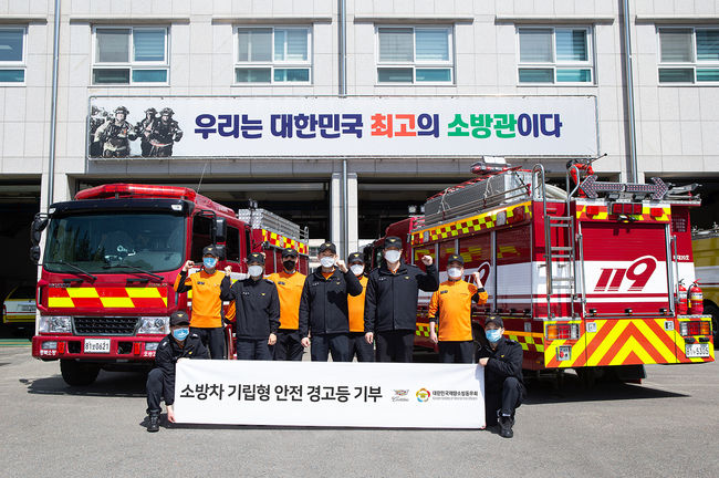 특별 제작된 기립형 안전 경고등 두 세트는 대한민국재향소방동우회를 통해 충청북도 청주시 청주서부소방서에 전달됐고 긴급 출동이 잦은 대형 소방차에 장착됐다. /100c@osen.co.kr