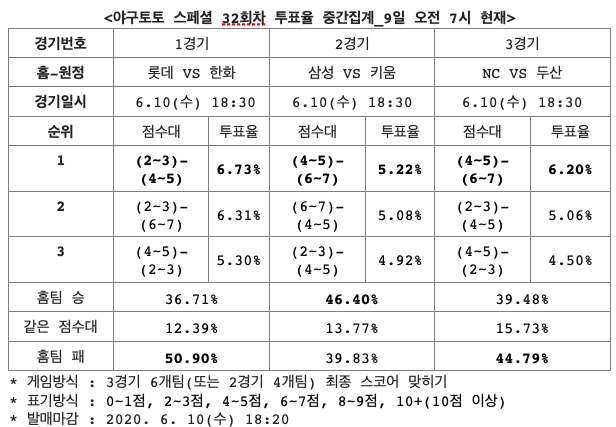 이번 야구토토 스페셜 32회차 게임은 경기 시작 10분 전인 오는 10일 오후 6시 20분 발매가 마감되며, 경기가 모두 종료된 후에 적중결과가 공식 발표된다.