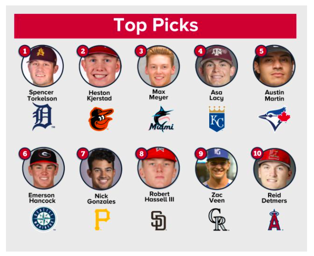 마이애미 말린스는 전체 3순위로 미네소타 대학 우완 투수 맥스 메이어를 지명했다. 캔자스시티 로열스는 전체 4순위로 텍사스 A&M의 좌완 투수 아사 레이시를 지명했다. 토론토 블루제이스는 반더빌트 대학의 유격수 오스틴 마틴을 점찍었다. 마틴은 MLB.com의 예상 드래프트에서 2순위 후보였다.