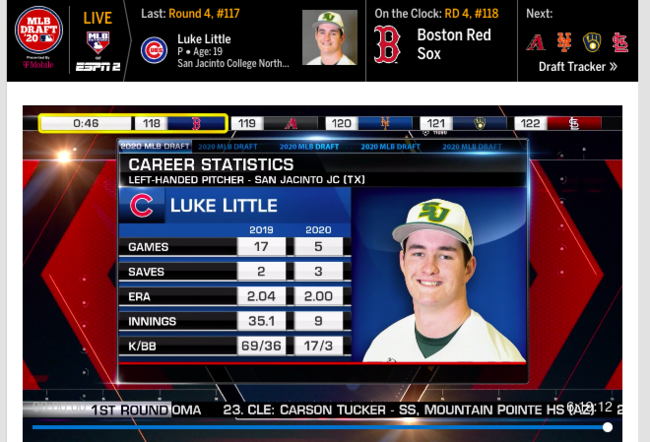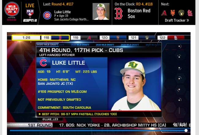 불펜 피칭에서 105마일(169km) 강속구를 던져 화제가 된 루크 리틀(19)이 2020 메이저리그 드래프트에서 시카고 컵스의 지명을 받았다.