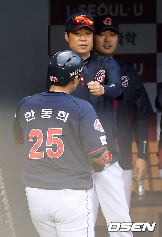 이후 민병헌이 땅볼로 물러났고, 손아섭의 2루타가 나왔지만, 정훈이 좌익수 플라이를 치면서 1회 이닝이 끝났다. 점수는 7-0으로 벌어졌다./ bellstop@osen.co.kr