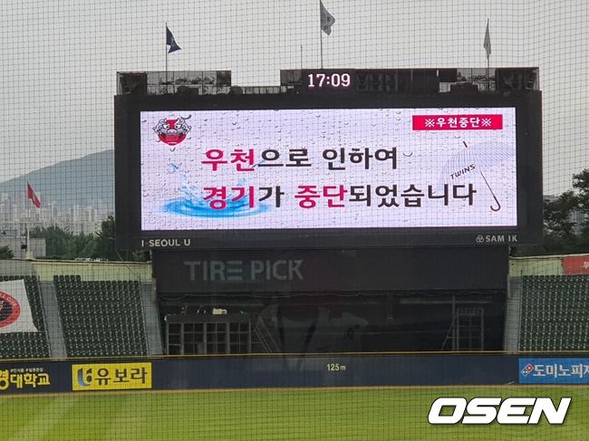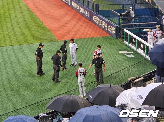 중단을 결정하자, 류중일 LG 감독이 나와 심판진에게 어필했다. '이 정도 비에는 경기를 계속해야 하지 않느냐'고 주장하는 듯 했다. LG 선발 김윤식은 1회초 16구를 던졌고, NC 선발 구창모는 1회말 등판 직전에 경기가 중단됐다.