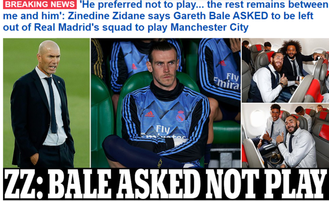 데일리 메일의 '브레이킹 뉴스'에 따르면 지단 감독은 맨시티전을 앞둔 공식 인터뷰서 전후 사정을 공개했다. 그는 "베일 본인이 맨시티전 명단 제외를 요청했다"고 밝혔다.