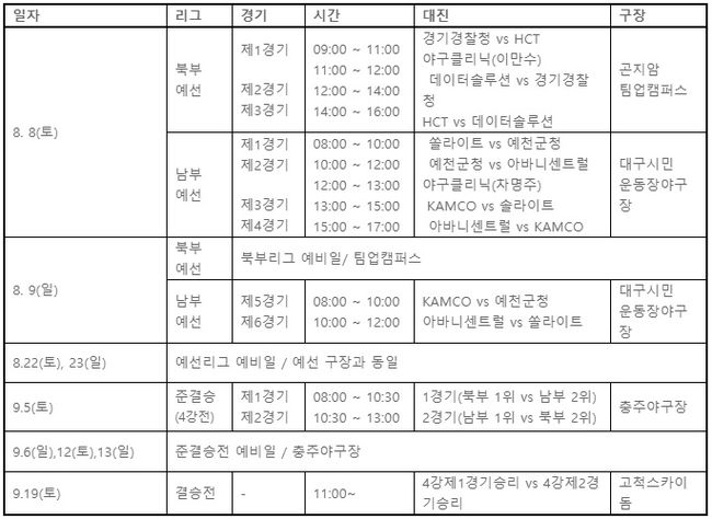 8일 열리는 예선전은 북부리그가 곤지암 팀업캠퍼스에서, 남부리그는 대구시민운동장 야구장에서 각각 펼쳐지며, 준결승전은 내달 5일 충주야구장에서, 대망의 결승전은 내달 19일 고척 스카이돔에서 열릴 예정이다.