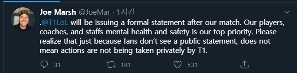 조 마쉬는 "경기 후에 공식 성명을 발표할 예정이다. 우리의 선수, 코치, 스태프들의 정신 건강과 안전은 우리의 최우선 과제"라며 "팬들이 공식 성명을 보지 않는다고 해서 T1이 개인적으로 조치를 취하지 않는다는 것을 의미하지 않는다는 걸 알아주기를 바란다"며 강력한 대응 의지를 피력했다.