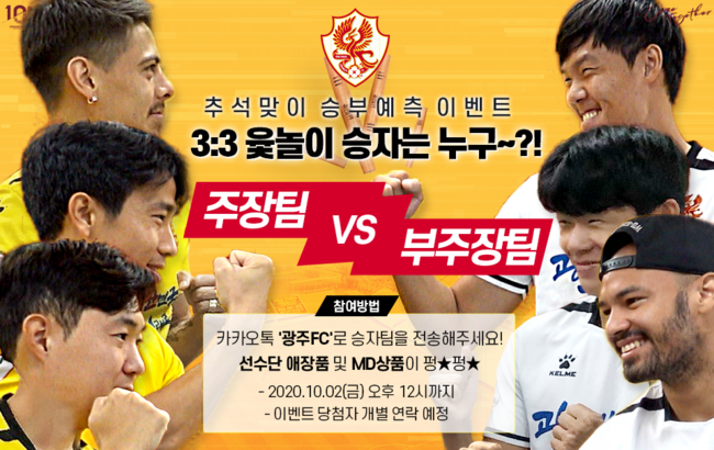 이벤트 참여는 최종 승자팀이 공개되는 내달 2일 오후 12시까지 카카오톡 광주FC로 승자팀을 예측(주장팀 / 부주장팀)해 전송하면 된다.