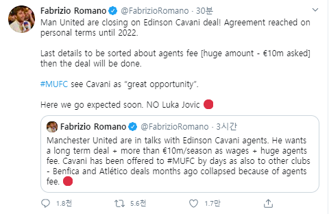 로마노는 "맨유는 카바니 영입 완료를 앞두고 있다. 계약은 2022년까지이며 거액의 연봉도 지불할 것이다"라고 상황에 대해 설명했다.