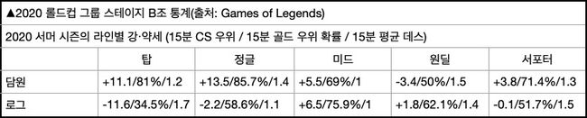 중요한 첫 경기에서 탑 라인의 불리함을 밴픽과 상성으로 극복한 로그는 4일 3번째 매치에서 담원과 만난다. ‘핀’은 ‘LOL 챔피언스 코리아(이하 LCK)’에서 맹장(猛將)으로 평가 받는 ‘너구리’ 장하권을 상대로 버텨낼 수 있을까. 아쉽게도, 데이터는 장하권 쪽으로 활짝 웃고 있다. 2020 LCK 서머 시즌 ‘퍼스트 탑’을 수상한 장하권은 라인전 지표인 15분 성적에서 압도적인 모습을 보이고 있다.