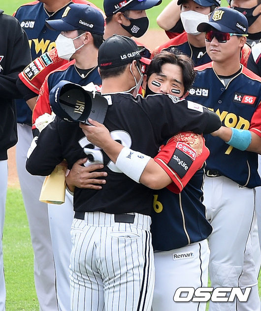 경기 시작 10분 전에 KT와 LG 선수단이 홈베이스 중앙에 도열했다. KT 선수단 대표로 주장 유한준과 LG에서 함께 뛴 박경수가 박용택에게 차례로 꽃다발을 증정했다.