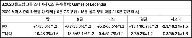 젠지는 프나틱을 맞아 어떤 전략을 세워야 할까. LOL e스포츠 데이터 분석가 ‘빈지’ 벤자민 롤카의 통계 자료에 따르면 젠지-프나틱 경기의 격전지는 정글 포지션이 될 전망이다. 프나틱의 정글러 ‘셀프메이드’ 오스카 보데렉은 지난 서머 시즌 명실상부 프나틱의 에이스였다. 경기의 향방을 결정하는 15분 지표 기준 ‘셀프메이드’는 15분 CS 우위(+13.5), 15분 골드 리드 확률(62.1%), 15분 평균 데스(1.2) 모두 팀내 최고 성적을 기록했다. 반면 젠지의 정글러 ‘클리드’ 김태민은 팀의 캐리 라인(미드-원거리 딜러) 대비 다소 부족한 성적을 냈다.