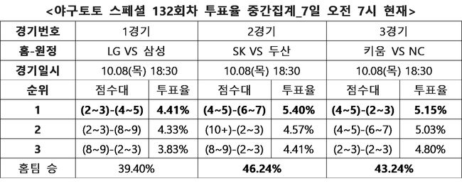 KBO 3경기 대상 야구토토 스페셜 132회차 투표율 중간집계