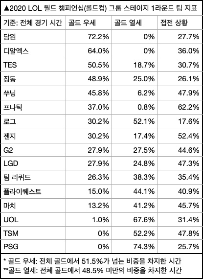 ‘2020 LOL 월드 챔피언십(이하 롤드컵)’ 그룹 스테이지에서 완벽한 퍼포먼스를 선보이고 있는 담원이 팀 지표에서도 최상위권을 기록했다. 1라운드 3경기 기준 ‘골드 우세 시간’ 부문에서 압도적인 1위(72.2%)를 차지했다.