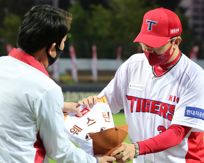 양현종은 브룩스의 유니폼을 입고 수상했다.