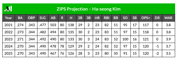 ZiPS는 김하성이 2021시즌 메이저리그에 진출하면, 타율 2할7푼4리-23홈런-82타점, OPS .820 WAR 3.8의 뛰어난 성적을 예상했다. 5년 계약을 가정하고, 2025년까지 매년 2할7푼대 타율과 23~24홈런, 80~83타점을 예상했다. WAR은 3.5~3.9로 전망했다.