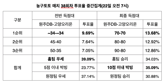 국민체육진흥공단이 발행하는 체육진흥투표권 스포츠토토의 수탁사업자 스포츠토토코리아가 23일(금) 오후 7시 원주종합체육관에서 열리는 원주DB-고양오리온전을 대상으로 하는 농구토토 매치 38회차 투표율을 중간집계한 결과, 참가자의 35.09%가 양팀의 10점 이내 박빙 승부를 예상했다고 밝혔다.