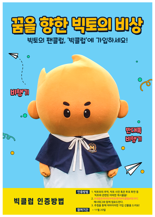 대구는 이번 ‘빅클럽’ 인증 이벤트 외에도 대구 전역에 빅토 응원 현수막을 거는 것은 물론 오는 25일(일) 시즌 마지막 홈경기에서도 빅클럽 인증을 독려할 예정이다.
