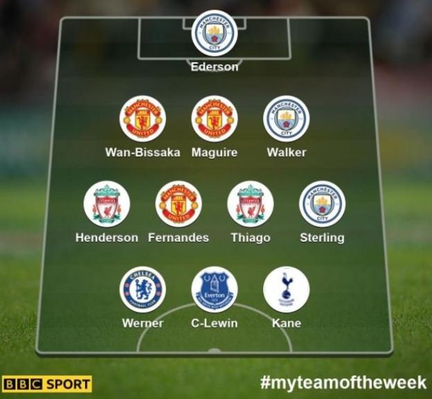 BBC는 지난 19일(한국시간) 2020-2021 프리미어리그 '가스 크룩스의 이주의 팀'을 발표했다. BBC에 따르면 해리 케인-베르너-칼버트-르윈이 공격진에 선발됐고 헨더슨-페르난데스-티아구-스털링이 중원에 자리했다. 완-비사카-맥과이어-워커는 수비수로 이름을 올렸고 골키퍼는 에데르송이었다.
