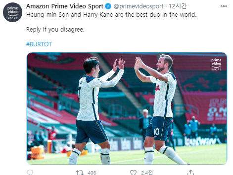 아마존 프라임 비디오 스포츠는 "손흥민과 케인은 세계 최고의 공격 조합이다"면서 "만약 아니라고 생각하면 리플 달아라"라고 주장했다.