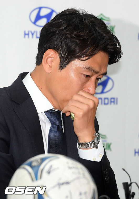 오랜시간 축구선수로 생활한 이동국은 여유로운 모습으로 기자회견을 시작했다. 축구 선수 중 가장 오랜시간 동안 스포트라이트를 받았던 그는 가족에 대한 이야기가 나오면서 눈물이 나왔다.
