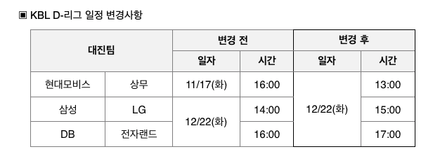 KBL은 11월 17일(화), D-리그 일정을 일부 변경했다. 당일 오후 4시 개최 예정이던 현대모비스 對 상무 경기를 12월 22일(화), 오후 1시로 변경해 진행한다.
