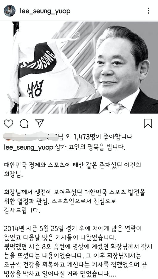 이승엽은 29일 인스타드램에 고 이건희 회장의 사진과 함께 세상을 떠난 그를 향한 감사의 글을 올렸다. 한국 야구 역사에 한 획을 그은 ‘레전드’ 이승엽은 스포츠를 사랑했고, 특히 야구에 대한 애정이 각별했던 고 이건희 삼성 회장에게 감사하고 존경하는 마음을 전했다.