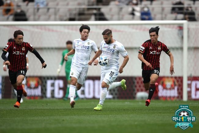인천은 전반 32분 찾아온 절호의 기회를 놓치지 않았다. 아길라르가 좌측면을 돌파한 뒤 각도가 없는 곳에서 시도한 슈팅이 양한빈 골키퍼의 손을 스치며 서울 골문을 갈랐다. 전반은 인천의 1-0 리드로 끝났다.