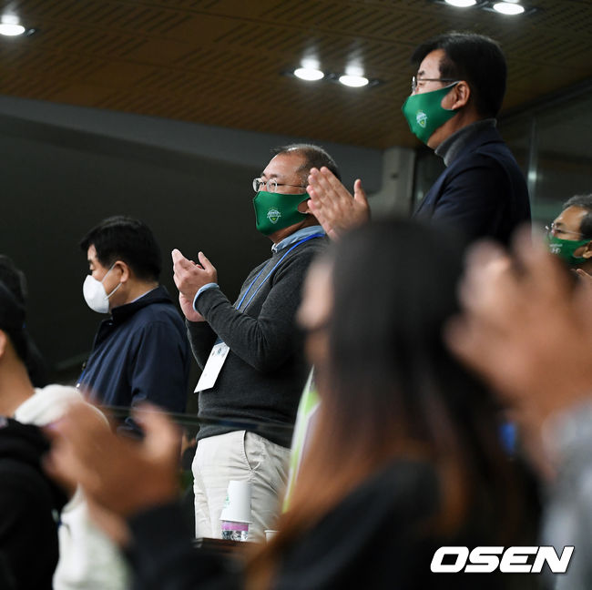 이날 경기에는 정의선 현대자동차 회장도 자리했다. 정 회장이 K리그 현장을 찾아 전북 구단의 경기를 보는 것은 이전에 한번 있었다. 2015년 10월 25일 서울월드컵경기장에서 벌어진 서울-전북전이었다. 당시 0-0 무승부였다. 정 회장은 약 5년 만에 다시 K리그 현장을 찾아 직관하는 것이다. 전주월드컵경기장에 첫 방문했다. 전북의 우승과 이동국 은퇴를 지켜보기 위해서다.