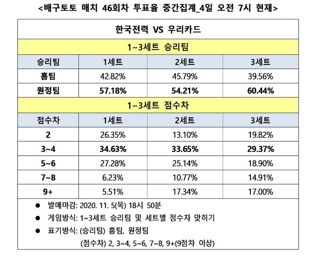 1~3세트 승리팀과 점수차를 맞히는 배구토토 매치 46회차 게임에서 1~3 세트별 예상 승리팀은 모두 원정팀인 우리카드의 차지로 돌아갔다.