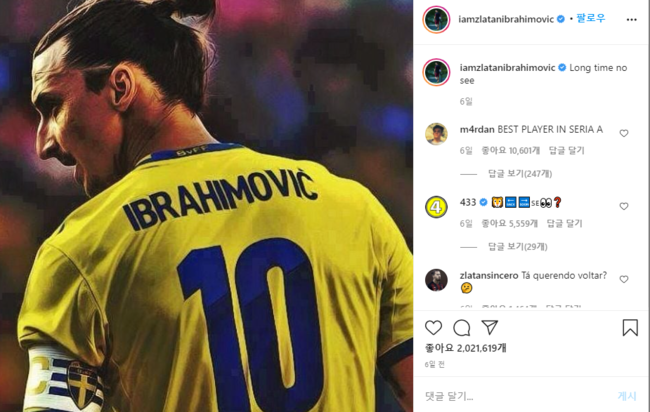 한편 즐라탄은 최근 스웨인 대표팀 복귀설이 돌았다. 대표팀 은퇴를 선언한 그가 자신의 인스타그램에 스웨덴 유니폼을 입은 모습과 함께 '오래 못봤지?'라고 올려 큰 관심을 모았다.