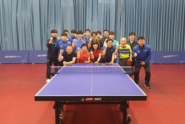 [사진]지난 10월 보람상조 스포츠 사회봉사단 B.L.P가 천안시 탁구동호인 재능기부 행사 기념 사진을 촬영하고 있다.