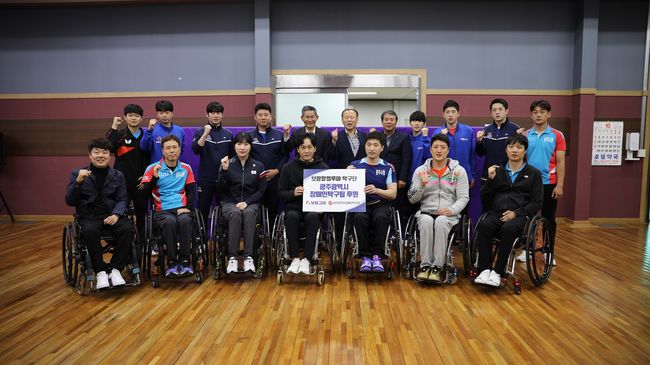 [사진]지난 10월 보람상조 스포츠 사회봉사단 B.L.P가 광주시청장애인탁구팀과 후원식을 갖고 기념사진을 촬영하고 있다.