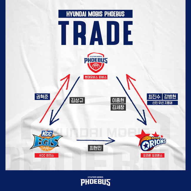 오리온은 최진수와 강병현을 현대모비스로 보내고, 현대모비스의 이종현, 김세창과 KCC의 최현민을 영입하는 트레이드다. 오리온과 현대모비스 그리고 KCC는 트레이드 결과를 11일 발표했다.