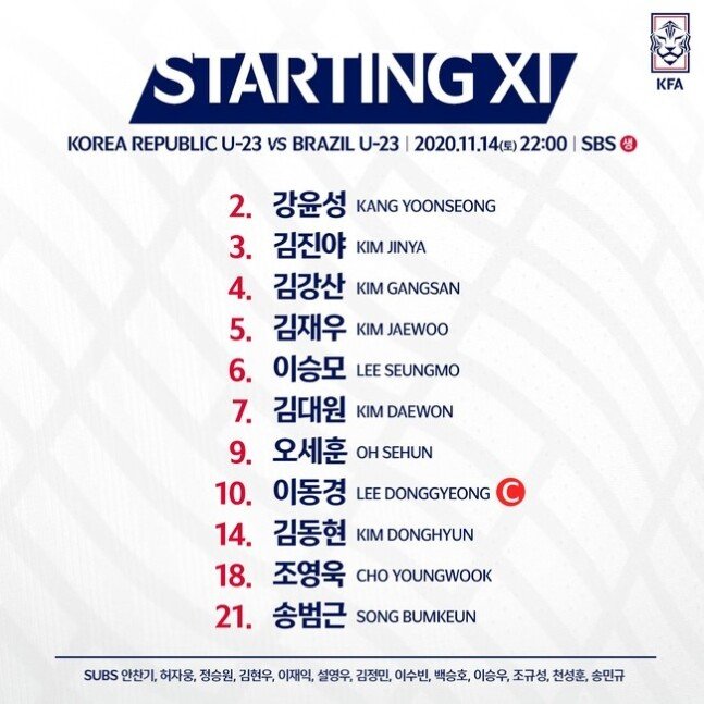 김학범호의 브라지절 선발 라인업이 공개됐다.